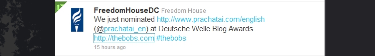 Image: US Neo-Conservative, corporate-financier run Freedom House "tweets" their March 11, 2011 nomination of NEDfunded "red shirt" propaganda clearinghouse, Prachatai.com.