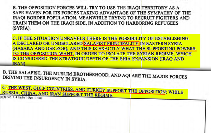 The West, Gulf countries, and Turkey support the opposition; while Russia, China, and Iran support the regime.In essence, the "Salafist" (Islamic) "principality" (State) was a creation of the US in pursuit of its attempted regime change agenda in Syria. The current, self-proclaimed "Islamic State" is situated precisely in eastern Syria where the DIA memo claimed its state sponsors sought to place it. Its role in undermining Damascus and its allies' attempts to restore peace and order to the Syrian state is obvious.
