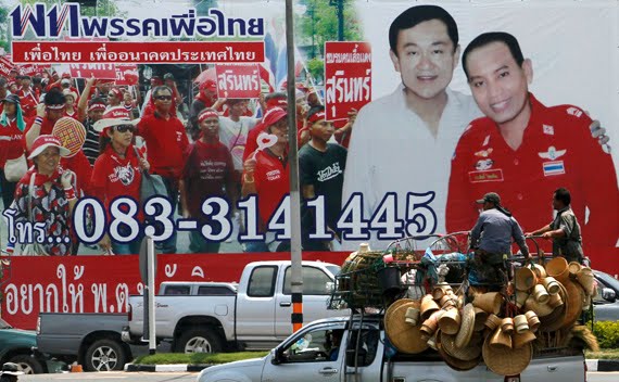 AFP "Thai poll rivals in final push for vote:" Polls show the main opposition Puea Thai Party, allied to fugitive former premier Thaksin Shinawatra, enjoying a lead over current leader Abhisit Vejjajiva's ruling Democrats ahead of Sunday's election. " Sky News continues, "Many think Thaksin will continue to call the shots if his party wins the vote, and its campaign slogan -- 'Thaksin thinks, Puea Thai does' -- appears to leave little doubt. Yingluck Shinawatra, tipped to become Thailand's first female prime minister, is a political novice widely seen as the political proxy of her older brother, who describes his sibling as his 'clone'."