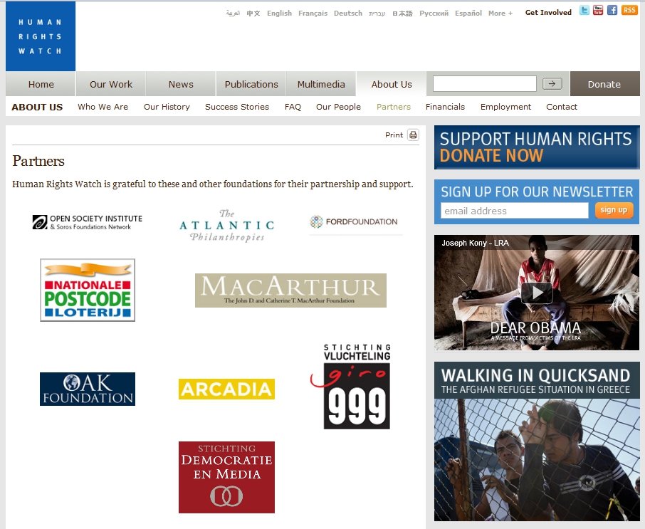 Image: HRW's partners include Wall Street speculator George Soros' Open Society Institute which also funds Invisible Children through a myriad of proxy foundations. Note on the right-hand side the "Dear Obama" video which is featured below. It was originally uploaded in 2010, but has just recently been featured on HRW's website in the midst of the recent Kony 2012 hysteria.