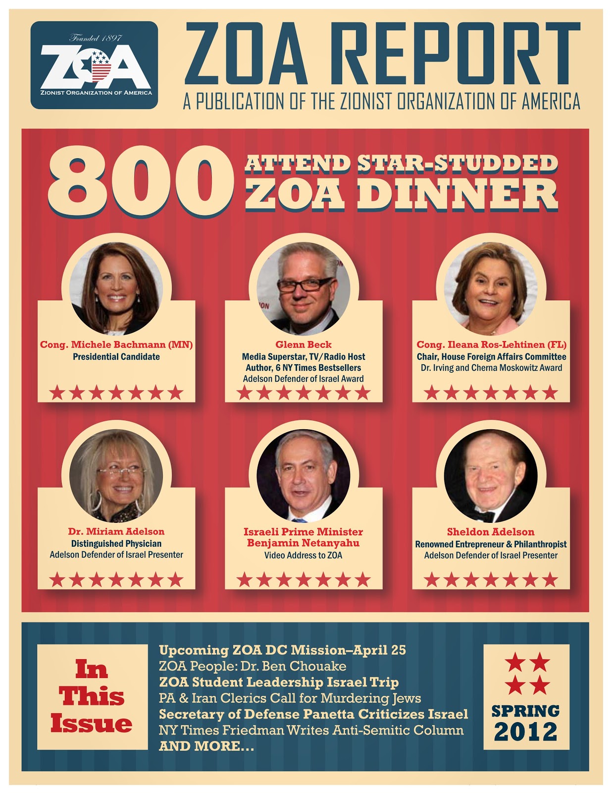 ZOA's 2012 annual report included a list of ZOA dinner guests that included Michele Bachmann, Glenn Beck, and Israeli Prime Minister Benjamin Netanyahu. The 40 page report deals only in talking points found across the false-right paradigm, and involves none of the frank, open policy discussion one might find in corporate-financier subsidized think tanks like the Brookings Institution, the Council on Foreign Relations, the RAND Corporation, or the American Enterprise Institute. And while many of the same personalities cross-over from propaganda fronts like ZOA, to think-tanks like Brookings, their narratives do not.